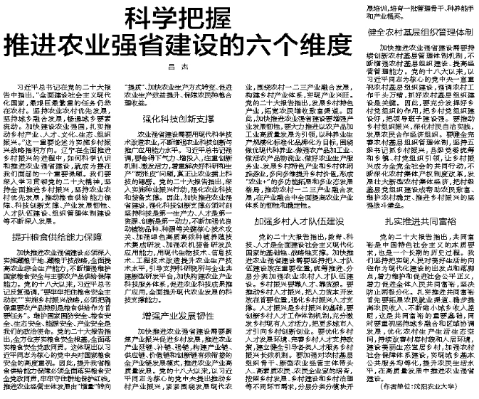 《辽宁日报》(理论版)1月31日刊发我校吕杰教授撰写的题为《科学把握推进农业强省建设的六个维度》的理论文章。